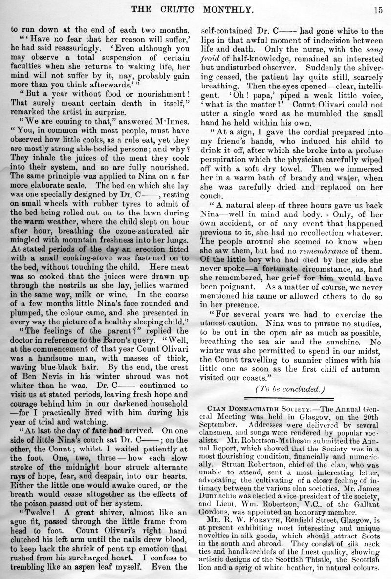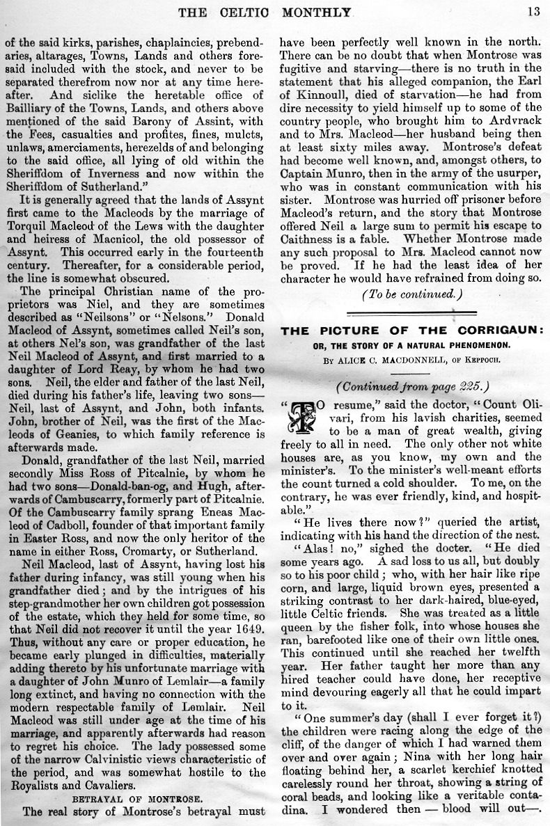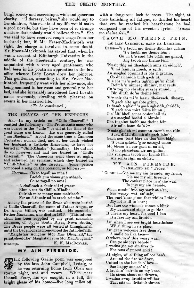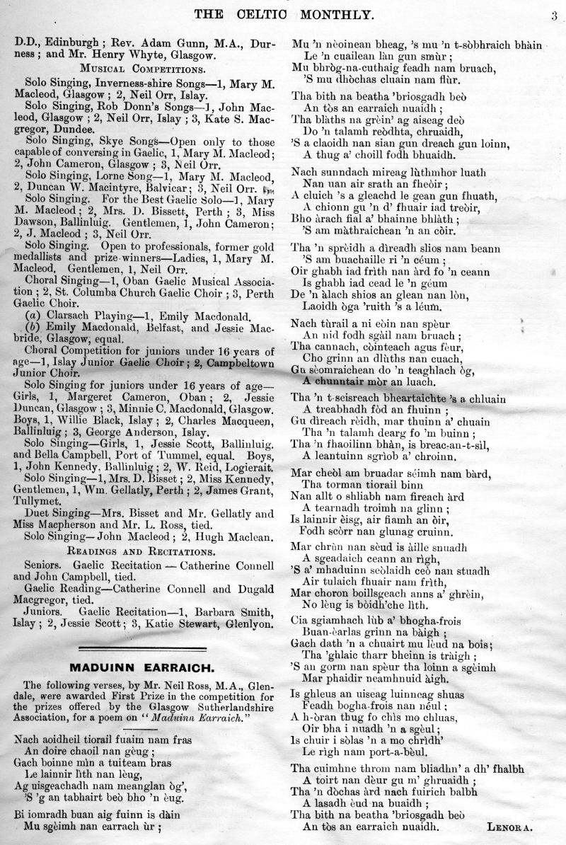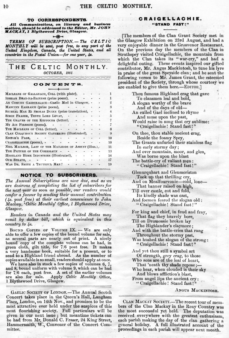 As well as Gaelic poems and their translations there are also articles on MacLeans of Gallanach, Coll, Gaelic Mod in Glasgow, Simon Fraser, Tenth Lord Lovat, The Graves of the Keppochs, The MacLeans of Coll, Clan Colquhoun Society annual gathering at Luss, Neil MacLeod, last of the MacLeods of Assynt, Highland Home Industries, etc.