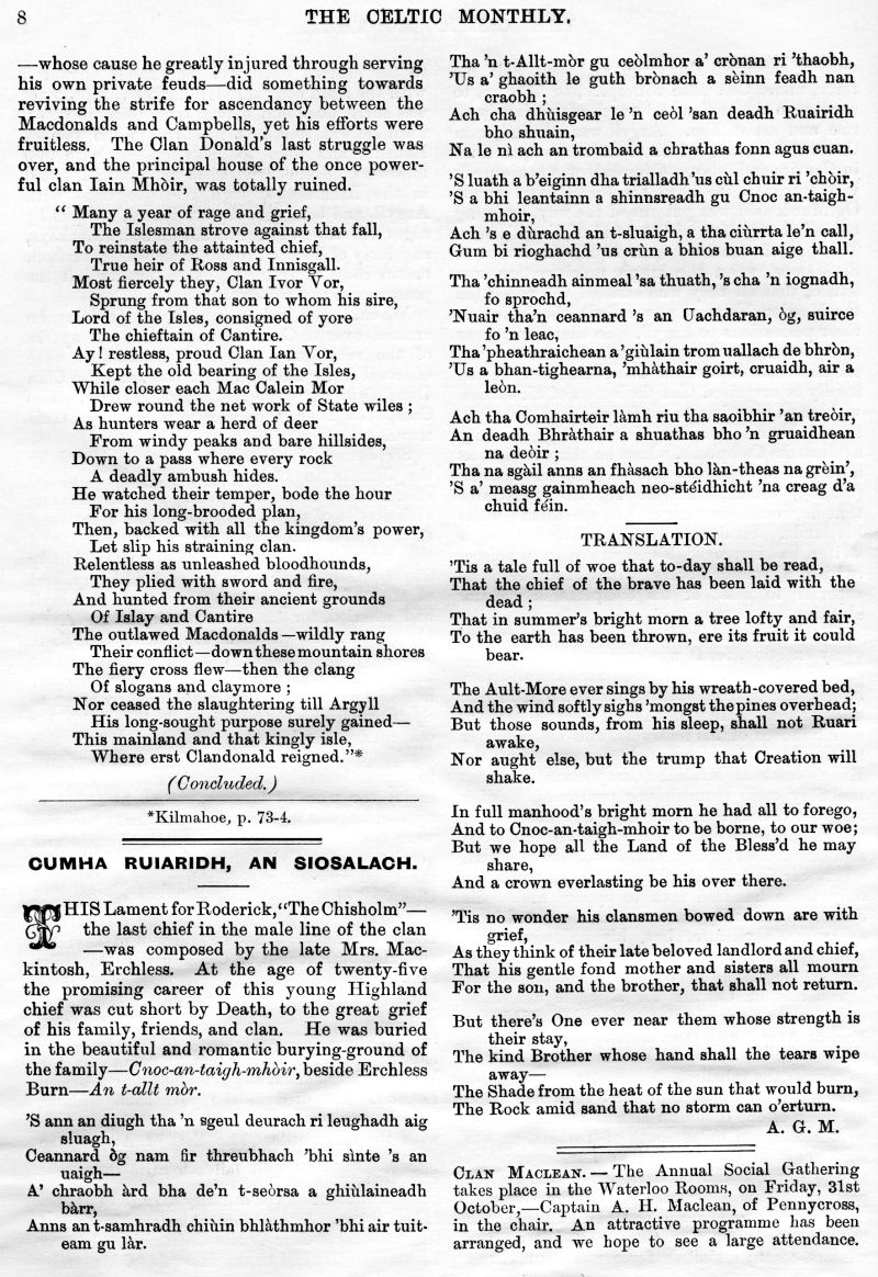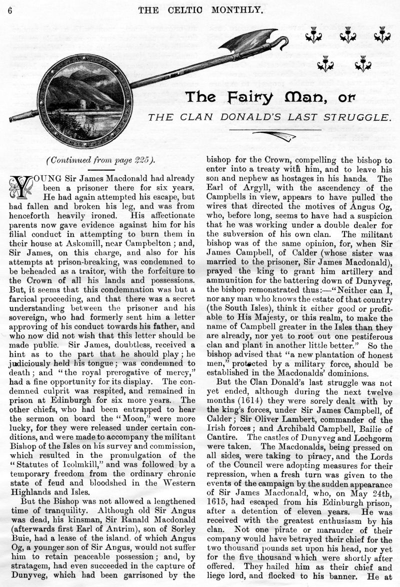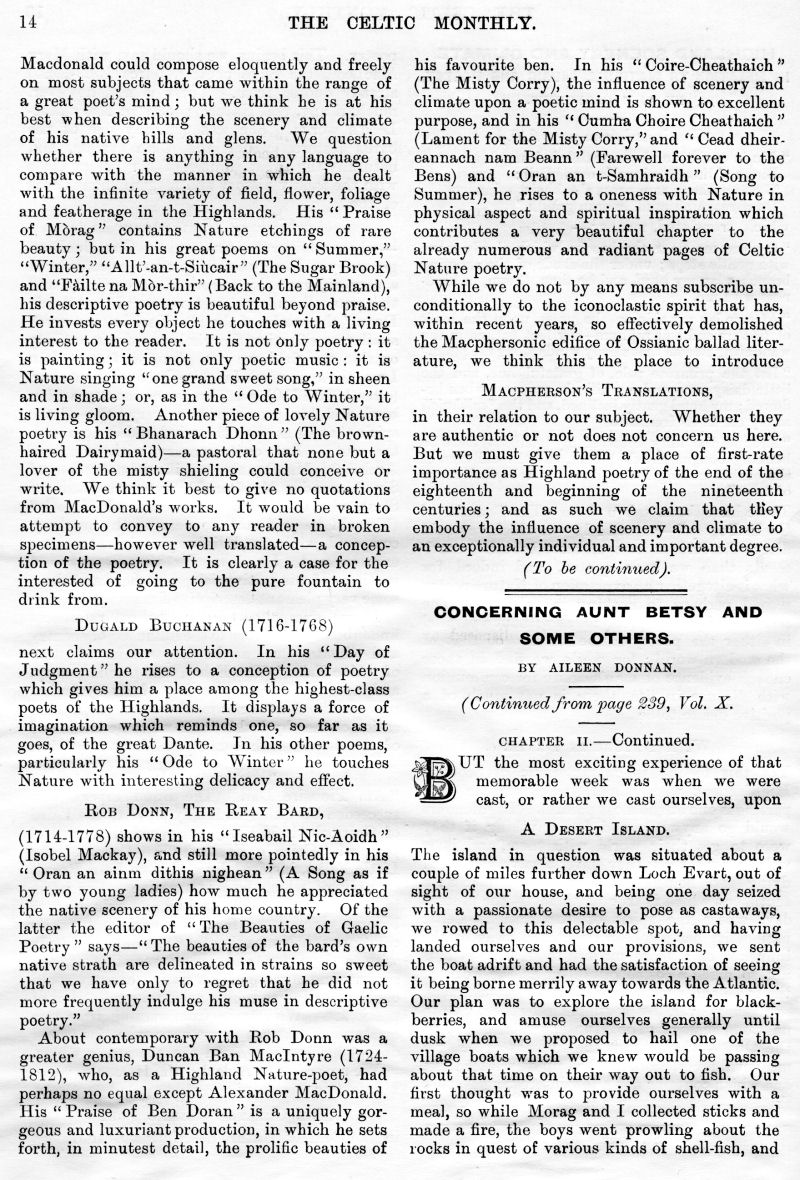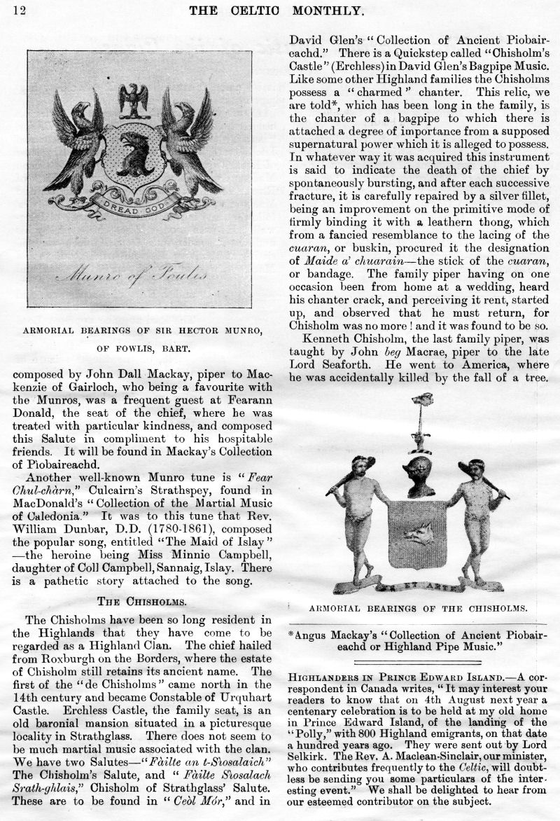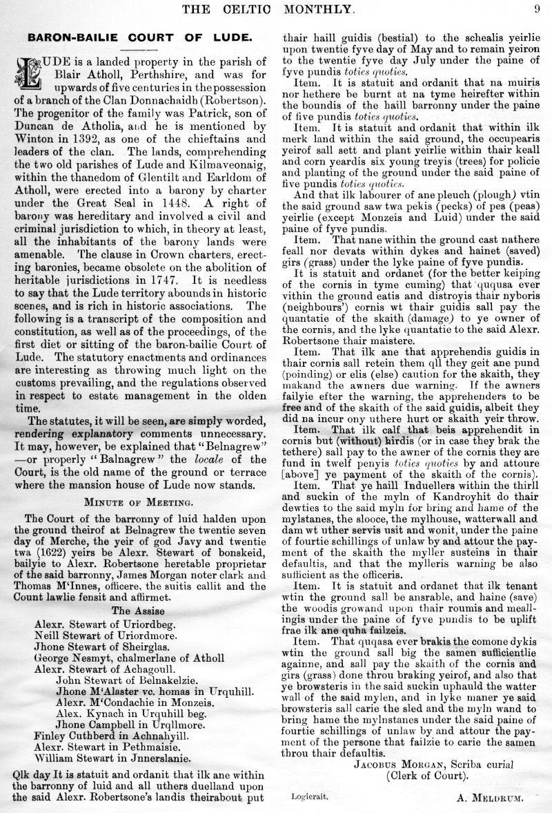 Sir Robert Menzies of Menzies - Baronet, King Edward's Coronation, Captain Ivory's Cave, The Highlands, The Fairy Man, Lament for Roderick "The Chisholm", Baron-Bailie Court of Lude, Highland Mod at Dundee, The Martial Music of the Clans, Highland Scenery and Climate, Concerning Aunt Betsy and Some Others, Duncan Ban MacIntyre, Emigrations from the Highlands during the Eighteenth Century, Armorial Bearings of MacLean of Dochgarroch, An Old Gaelic Saying.
