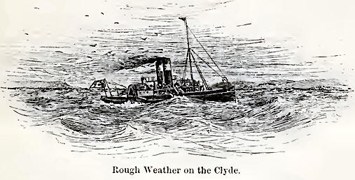 The Clyde steamers are all weatherly boats, and can bear up against a stiff sou’-wester in the firth nobly; and, indeed, they would require to be able to do so, as the choppy sea raised in such gales, especially with an ebbtide, is like that of the “channel,” short and angry, and pitches the boat about in a wonderful manner. A graphic picture of the stormy nature of the outlying part of the firth is given in Sketches of Highland Character. A passenger goes on board the Arab lying at Greenock, ready to start for the West Highlands, and overhears the following colloquy:—