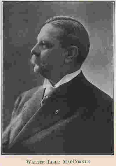 WALTER LISLE MACCORKLE, a prominent attorney of New York City, was born at Lexington, Rockbridge Co., Virginia, March 14, 1854, the second son of William Henry and Virginia (Wilson) MacCorkle, Mr. MacCorkle’s father (son of Samuel MacCorkle), a planter, who occupied many positions of honour and trust in Virginia, was descended from good American ancestry of Scottish blood. The name MacCorkle is a contraction of the clan name MacCorquodale, a sept of Clan MacLeod, generally derived from Torquil, one of the two sons of Leod, son of Olaf the "black king" of Man and progenitor of the clan. The earliest form of the name MacCorquodale is found in 1434. Modern forms of the name are MacCorkle, MacCorkill, MacCorkindale and MacCorquodale. The armorial insignia is described heraldically as follows: Argent a demi stag gules naissant out of a fesse tortilla of the second and first. Crest: a stag standing at gaze, attired gules. Motto: Vivat Rex. The MacCorkles are entitled to wear the tartan of Clan Gunn as well as that of MacLeod.