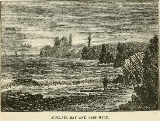 He rose at midnight and did his morning’s work. The bread was all ready for sale when he set out at four o’clock. He first made for Castleton, tramped across the sands at Dunnet, and steered south-east for Sinclair Bay, with rain, snow, or sleet accompanying him the whole way. He passed many boulders of the old red conglomerate. He passed along the verge of four lakes, the moss and heather beside them all saturated with water—elush, slush, slush! At length his ears were greeted by the sounds of old ocean thundering along the beach of Sinclair Bay, with Noss Head in the distance.