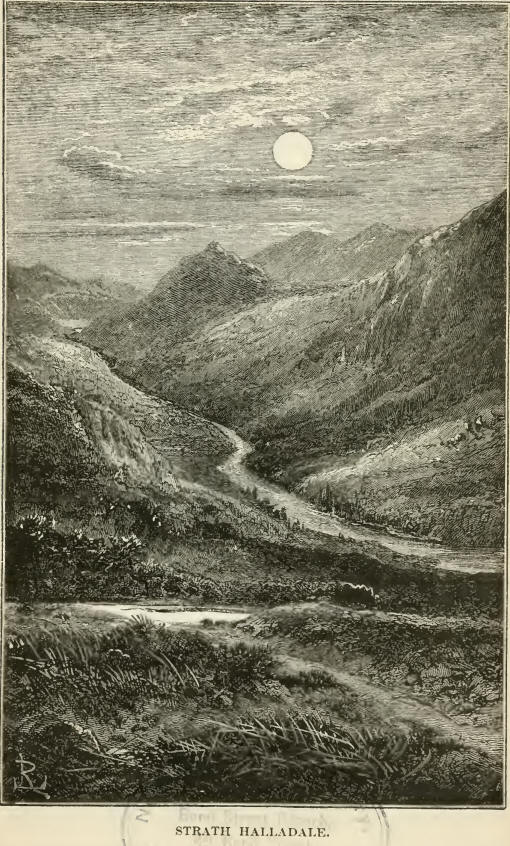 “There is a good hard road up the strath, and it winds along the river side. The granitic debris lies thick on the hill-sides, and boulders by the million. Above all, the bottom of the valley lies delightfully low. The bed of the river, where it enters the sea, is scarcely, if at all, above high-water level. Tor many miles up the strath the water scarcely runs. How, there is a deep pool, hemmed in with rolled pebbles, over which the stream struggles. It runs on a little, and then there is a pool again.
