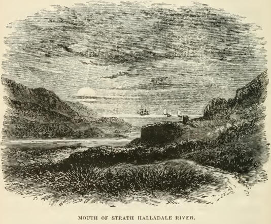 “About nine miles up, 1 found the full reward of my labours in the fact that there was no impediment, but indeed every facility for the sea entering the country and drowning Caithness, were there only some upheaving agency to hitch it up some 100 feet or so. It was simply to test this, that had brought me thus far. The road winds up among the hills—hollow, all hollow: hence, I suppose, the name Strath Hollowdale, or Halladale—half Highland and half Horse. The strath was, in my opinion, once an outlet of the sea, just as Loch Tongue and Loch Erriboll are now.”