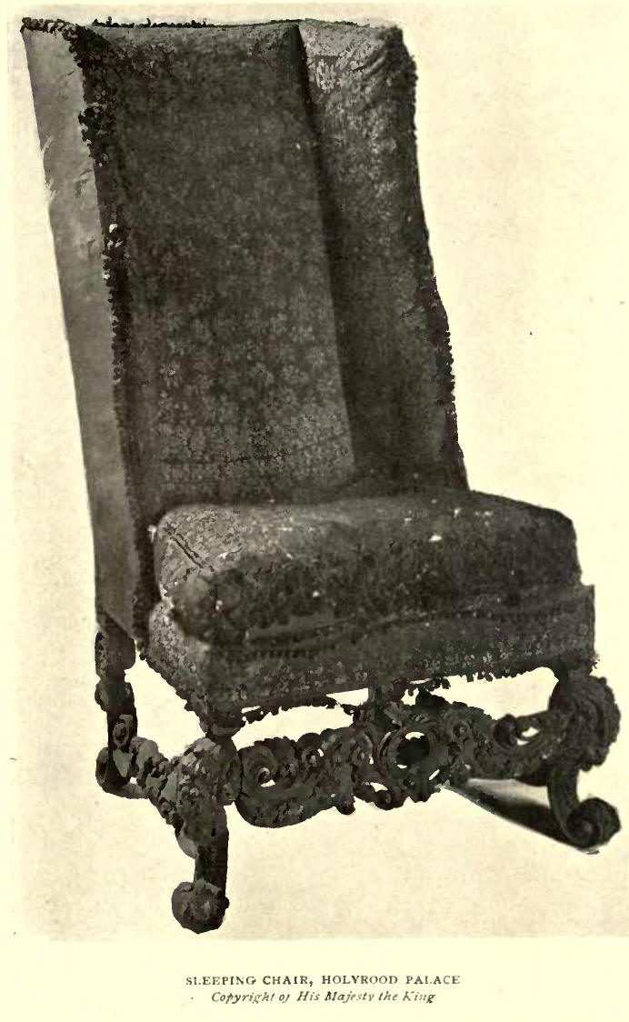 Another piece of furniture which is decorated with the crown is the day bed, generally called in Scotland the "resting" or "reposing bed." The day bed, which was the forerunner of the modern sofa, was known in Elizabethan times, and is, indeed, mentioned by Shakespeare. It was only after the Restoration, however, that it came into common domestic use, and it was a considerable addition to the comfort of the hitherto scantily furnished drawing-rooms of the time. Like the chairs, these resting beds stood on spiral legs connected with spiral stretchers, and they had the carved band showing the crown and scrolls in front. The seat was covered in cane. At one end was a back intended to support the shoulders, and the inclination of this back could be varied and fixed by strings to the uprights. The back and the long seat were furnished with bright-coloured cushions, and altogether the resting bed was a picturesque and characteristic piece of furniture. It marks, perhaps, the beginning of the propensity to lounging which inspires so much of our modern furniture and makes the club smoking-room the paradise of the lethargic sprawler. The day bed, as a concession to human indolence, was accompanied by the sleeping-chair, a good example of which may be seen at Holyrood. It is comfortably upholstered and the back has a projecting wing at each side, so as to form corners in which it was possible to dose with the head supported and sheltered from draughts. Notice, as a feature which this chair shares with the crown and other contemporary types of chair, the carved band which connects the front legs some way from the ground. As long as rushes were in use for covering floors, it was practically impossible to keep floors sweet and clean, and much unsavoury debris of one kind and another was apt to accumulate. The chairs and tables of those days accordingly show a plain stretcher near the ground on which the feet could be supported and kept clear of the floor. But when rushes gave place to carpets or to bare floors, which are often shown in seventeenth-century prints, the low stretcher had become an encumbrance which prevented people from tucking their feet below their chairs if they wished to do so. The stretcher, which strengthened the chair by binding the front legs together, was therefore raised, and, being no longer exposed to wear and tear from human heels, it developed into a decorative feature and was enriched with carving. How elaborate this carved decoration became may be seen in the double chair, also at Holyrood, which bears a ducal coronet and a monogram embroidered on the back of each seat. It appears to date from about 1680.