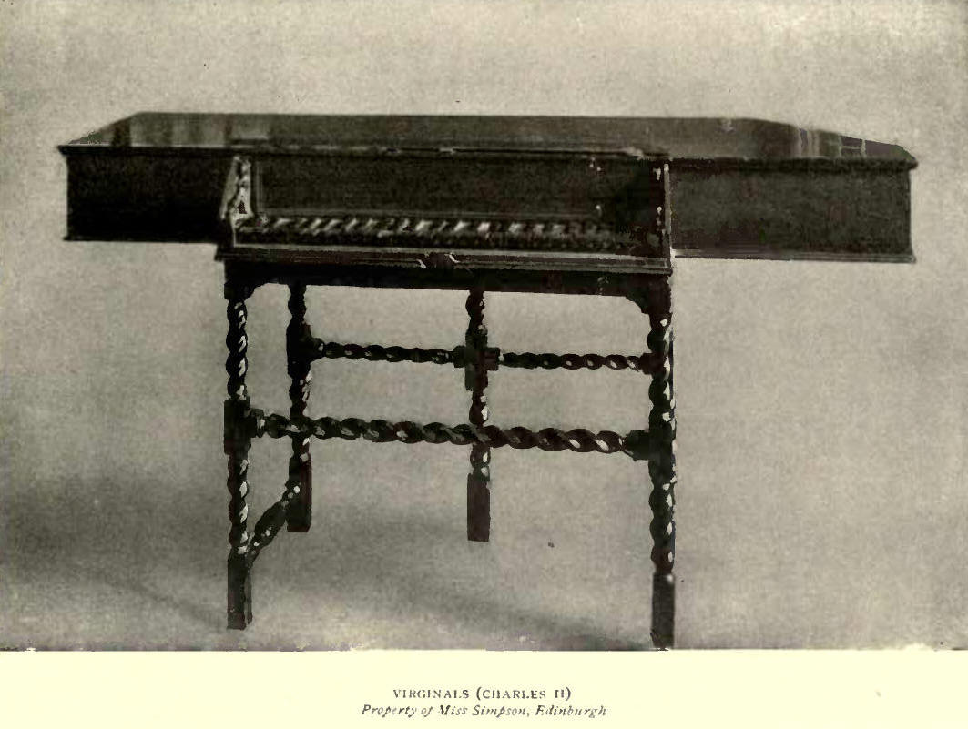 The introduction of these folding tables and of furniture of a comparatively light kind, which could be easily moved from one part of a room to another, and the gradual adoption of tea and coffee, and many other small changes of habits, served cumulatively to bring a more modern atmosphere into the domestic life of the time. There was also a considerable development of the taste for music in private houses. Young ladies were taught to play the viol and the virginals, to the pride of their parents and, let us hope, to the satisfaction of less partial listeners. The charming pair of virginals shown in Plate XVI is a good specimen of the instruments on which they performed. It has spiral legs corresponding to those of the chairs and tables of the time. The keys, instead of being faced with ivory, are of solid boxwood, which was the material used for that purpose in Charles II's reign, and they are worn with the touch of slender fingers which made music two hundred and fifty years ago. The compass is only about four and a half octaves, and the tone was sweet and delicate, not powerful and sonorous like our modern pianos with their massive iron frames and their heavily loaded wires stretched at enormous tension. At each end of the keyboard is a little carved figure, and one cannot but feel that this instrument, if less efficient, is at least in outward form much more charming and sympathetic to the artist than the French-polished and stony-hearted looking monsters which are its modern descendants. The fifth, or central, leg seems to be an eighteenth century addition designed to carry a lever operated by a pedal for the purpose of opening and closing the lid in order to increase or diminish the volume of tone. The expression "pair of virginals" does not, of course, denote two instruments, but merely refers to the series of notes, as in old times a rosary was called a pair of beads,"or as we still talk of a "pair of stairs."
