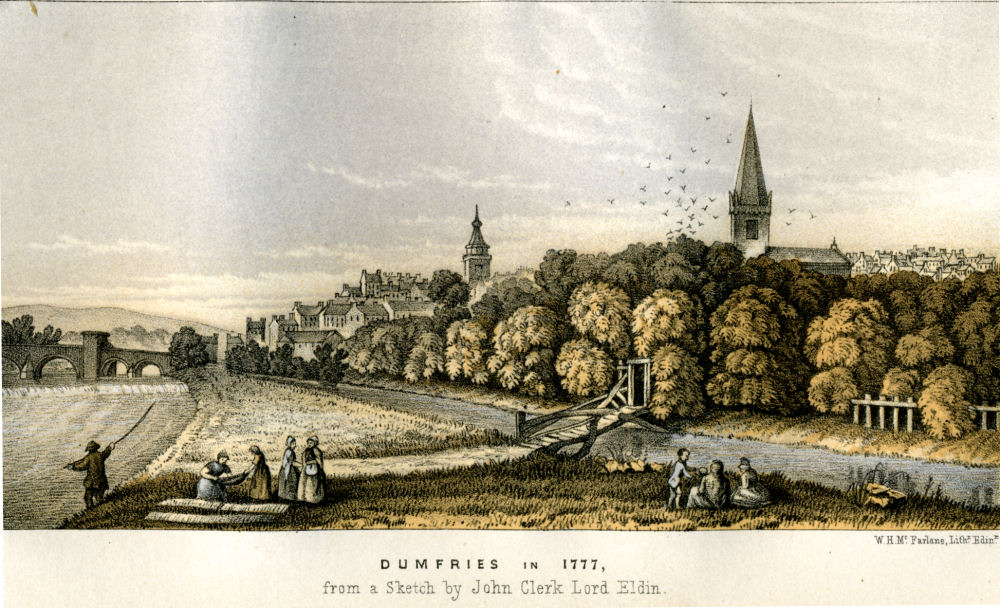 A few years after this riotous outbreak, some of its leading features were reproduced, with the addition of others still more tragical. Another dearth, with its train of suffering and repining, visits the Burgh; and it is again caused or intensified by the grain dealers and farmers exporting their stuff rather than sell it to the townspeople at a lower price. The "masterful invasions and depredations" of 1771 are repeated, only they are this time directed against vessels in the river, and the yellow corn growing upon its banks. A party of the marauders, hurrying down the Dock, lay violent hands on some farmers who are sending their produce out of port. Not a single sack can be got on board ; and the ships have to sail away minus their expected cargo, whilst the frightened ruralists beat a rapid retreat, leaving their precious stuff in the possession of the crowd. Another party of them openly resolve upon a plundering expedition to Laghall, a farm on the Galloway side of the Nith. Fortunately the announcement reaches the ears of one Janet Watson, "a servitrix" at the very farm that is threatened with such an unwelcome visit. Off at once she sets down the Dumfries bank, crosses the river, which was very shallow at the time opposite Mavis Grove, hurries to Laghall, near by, and raises the hue and cry with such effect, that before the predaceous rioters arrive such a guard is mustered at the farm that the former, resolute though they are, never venture within fighting range, and, fairly out-generaled by the faithful Janet, beat a retreat back to the Burgh-only, however, to become more unruly there.