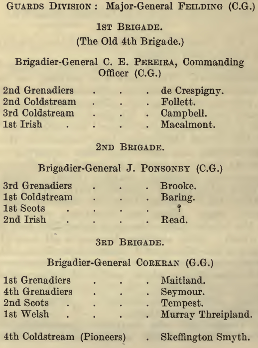 “Before the Division was formed the 1st Coldstream and the 1st Scots were in the 1st Brigade with the 1st Black Watch and the 1st Camerons ; the 2nd Scots and the 1st Grenadiers in the 20th Brigade with the 2nd Gordons and the 1st Border Regiment. The others are new Battalions.”