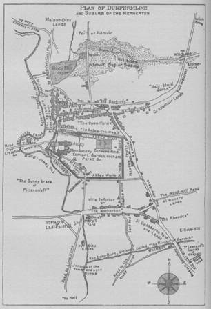 1501.—BEGINNING OF THE 16TH CENTURY—JAMES STUART, Second Son of James III., Commendator of Dunfermline Abbey.—At this period there were 38 monks and about 1 officials connected with the Abbey.  Population within the walls of the Abbey, about 50.  The population of the burgh, about 1300.  David Coupar, Alderman or Provost.  Trades: Smiths, weavers, shoemakers, tailors, masons, wrights, bakers, and fleshers.  At this period there was much “religious discontent” in Dunfermline, as in other monastic towns. (See Annals, “Destruction of the Abbey in 1560.”)  Annexed is a Plan of Dunfermline in 1501, compiled by the writer from old sketches of “landes, yairds,” &c., in the burgh, and from title deeds and charters, which the reader may with confidence receive as a correct “Plan of the Burgh and the Abbey Grounds of Dunfermline in 1501.”