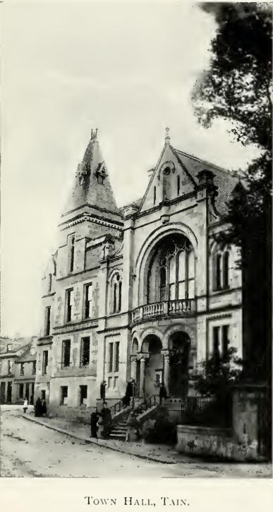 In the town there is much variety in the arrangement of the streets and, as in all old towns, a few of the streets are narrow and in them the houses are arranged unconventionally, but many of them have gardens, some of which are terraced. All houses are nicely built of white sandstone from the hill of Tain quarry. High Street is the chief business centre, and in an open space on one side stands a beautiful decorated Gothic monument to the memory of Kenneth Murray of Geanies. Here are the Court house, Council Chambers, and the old Tower by the doorway of which stands the old Market Cross. One of the best known buildings is the Royal Academy, established by charter in 1813, and is the only Secondary School north of Inverness. It is endowed, ably conducted, and continues to maintain its long established high reputation as the educational centre of a wide district. There is also a handsome Town Hall, as well as a Carnegie Free Library.