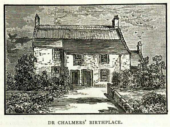 Lately the dwelling had become very dingy and somewhat dilapidated, but a few days ago (June 1885) it was bought by Mr Fortune, chemist, for £80. Already he has repaired the roof, and given the building a new face of cement. The whole house is to be thoroughly renovated and fitted for a better class of tenants. With praiseworthy consideration he is not to interfere with the special room beyond cleaning it. The wooden pannelling and box-bed are to be left intact. The house is two storeys in height, and has a large garret besides, and capacious cellars underneath—the beams of the latter being of good sound oak. Chalmers was one of a family of fourteen, and was born on the 17th of March 1780. It seems that this house was not the usual residence of his parents, that, in fact, they had oniy gone into it while their own domicile was being repaired or altered. His father’s shop, which was a little further west in the same street, but on the opposite side, has been transformed into a post office; and, immediately to the west of it, there is a rather ruinous range of build­ings which was formerly the thread manufactory of Chal­mers and his brother-in-law. It has been asserted that the refuse and dye from this manufactory drove the salmon from the Dreel. Be that as it may, immediately behind these buildings stands the house in which Thomas Chal­mers spent his youthful years,. and where his parents lived and died. There the active Bailie, who was diligent in business and fervent in spirit, enjoyed his favourite authors, James Hervey and John Newton. He was particularly fond of the once-famous and widely-prized Theron and Aspasio. When the Doctor came to visit his worthy parents in 1816, nothing brought back the old times more forcibly to him than an Anstruther Sabbath. “In the spring of 1845, Dr Chalmers,” says his biographer, “visited his native village. It almost looked as if he came to take farewell, and as if that peculiarity of old age, which sends it back to the days of childhood for its last earthly re­miniscences, had for a time and prematurely taken hold. of him. His special object seemed to be to revive the recollections of his boyhood — gathering Johnny Groats by the sea beach of the Billowness, and lilacs from an ancient hedge, taking both away to be laid up in his repositories at Edinburgh. Not a place or person familiar to him in earlier years was left un­visited. On his way to the churchyard, he went up the very road along which he had gone of old to the parish school. Slipping into a poor looking dwelling by the way, he said to his companion, Dr Williamson, ‘I would just like to see the place where Lizzy Geen’s water-bucket used to stand ‘—the said water-bucket having been a favourite haunt of the over-heated ball­players, and Lizzy, a great favourite, for the free access she allowed to it. He called on two contemporaries of his boyhood, one of whom he had not seen for forty-five, the other for fifty-two years, and took the most boyish delight in recognising how the ‘mould of antiquity had gathered upon their ‘features,’ and in recounting stories of his school-boy days. ‘James,’ said he to the oldest of the two, a tailor, now upwards of eighty, who in those days had astonished the children, and himself among the number, with displays of superior knowledge, ‘you were the first man that ever gave me something like a correct notion of the form of the earth. I knew that it was round, but I thought always that it was round like a shilling till you told me that it was round like a marble.’ ‘Well, John,’ said he to the other, whose face, like his own, had suffered severely from small-pox in his child-hood, ‘you and I have had. one advantage over folk with finer faces—theirs have been aye getting the waur, but ours have been aye getting the better o’ the wear!’ The dining-room of his grandfather’s house had a fire-place fitted up behind with Dutch tiles adorned with various quaint devices, upon which he had used to feast his eyes in boyish wonder and delight. These he now sought out most diligently, but was grieved to find them all so blackened and begrimed by the smoke of half a century, that not one of his old wind-mills or burgomasters was visible.” Two years later he followed his parents to the Better Land.