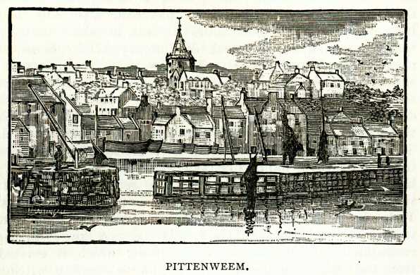 Population, Public Buildings, &c. —  In 1751, the population of the parish was only 939; in 1792, it had risen to 1157, all of whom resided in the town except 4 families; in 1831, it was 1317, and of these only 8 lived outside the burgh; in 1861, it was 1710, of whom 1617 dwelt in the burgh; and in 1881, it had still further in­creased to 2119, and of these 2116 were within the royal burgh. There are three churches in the town — the Established, the U. P., and the Episcopal. There are two public schools, a post and telegraph office, branches of the Clydesdale and National Banks, a Savings’ Bank, and a gas-work. John Douglas, Bishop of Salisbury, was born in Pittenweem in 1721, where his father was “an extensive wine, timber, and iron merchant . . . and carried on business in an antique and respectable-looking house in the Shore Street, in which his mahogany desks and counters  remained.” “The great hail stood 30 feet back from the street, and the entry was by a large gate. The house was handsomely fitted up with wainscot panneis, the moulding all round, the cornices were richly gilt, and the chimney piece was beautifully carved in oak.” Among the more enterprising natives of the present day, the Hendersons of the Anchor Line hold a prominent and honourable place. It was in Pittenweem that Wilson and his associates robbed the collector of customs in 1736. In his Heart of Midlothian, Sir Walter Scott has immorta­lised the occurrence, and the tragic events to which it led. The man who took the rope from a shop with which to hang Porteous, and laid down a guinea for it, was named Bruce. He afterwards returned to Anstruther and prac­tised as a barber. It is more devoutly to be hoped that the first line of the old rhyme on this burgh will never be fulfilled than that the rest of the prediction shall