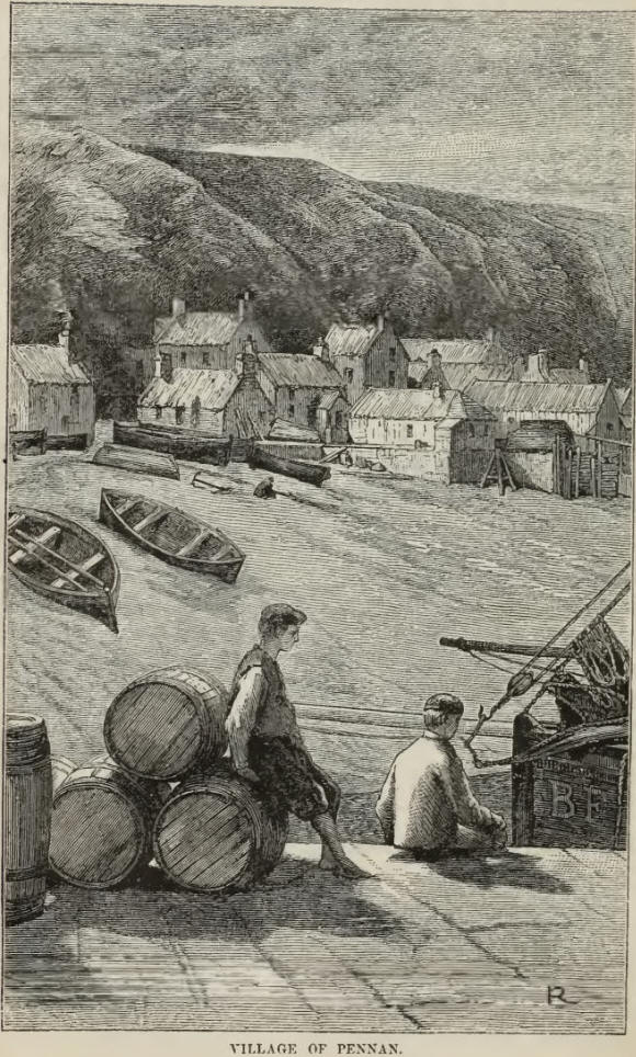 During breeding-time the clamor of the sea-birds is tumultuous, though the lashing of the sea at the foot of the cliffs tends to a great extent to lull their noise; but toward evening all becomes still again. Edward frequently ascertained this by personal experience. Being in the neighborhood of Pennan one day, he went along the Head, in order, if possible, to get a sight of the far-famed eagles of the promontory. He was unsuccessful on the occasion. He had loitered by the way, and the declining day at length warned him to leave the place without seeing the coveted sight. His road westward lay along the coast. With disappointed hopes, he trudged along, scarcely thinking how the hours were flying. At length it became dark as he approached the broom braes of Troup. He found himself fairly be-nighted. At the same time, he was tired and weary. He had endured many outs and ins, ups and downs, that day. His intention was to have gone to the house of his old shop-mate at Gardenstown and spend the night; but now he felt, from his worn-out condition, that it would have taken him nearly two hours’ walking to reach the place. He therefore determined to stay where he was, or rather, to go down to a sleeping-place near Troup Head, to ascertain how his feathered friends conducted themselves during the night-time.