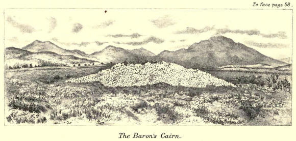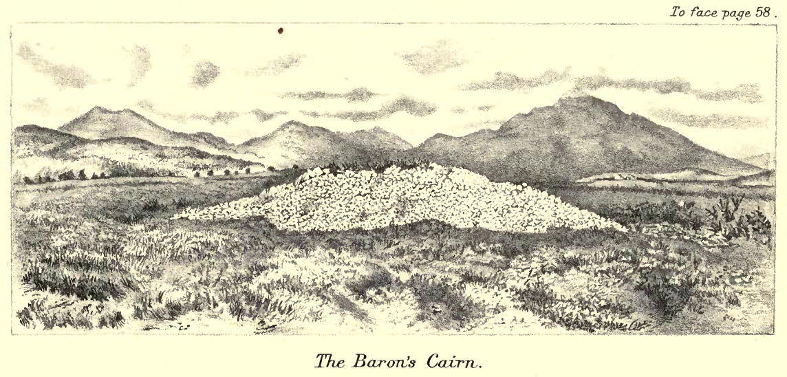 Cameron.—Yes; but we don't go far. You see that gray pile of stones standing solitary in the moss: it is the carzz a' Blearan (the cairn of the Baron). It is a melancholy object and takes away from the bright natural scenery, but it is a powerful proof to us that men who revered others have lived here. You will observe that it is built on the solid ground, and the peat has grown above the foundation and nearly to the summit of the cairn.