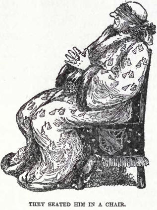 Then they bandaged his eyes with an old dishclout they got from somewhere; for a handkerchief would not go round his face, he had such a very big nose; and, having seated him in a chair, they all ran round him in a circle, some this way, some another; but they all only got very giddy and banged each other’s heads, a thing which hurt, and did not conduea to good-temper or to the solving of the difficulty; and, worse than all, just at the end, when they could run no longer, and were quite out of breath, Eliza Diarmed, the fat widow who kept the confectionery-shop, fell plump against the chief magistrate, and sent h'm and his chair flying all along the floor.