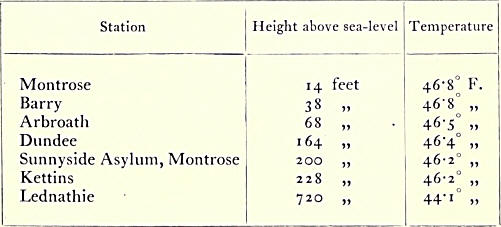 The following table, compiled from the late Dr Buchan’s papers, shows the mean temperature over forty years ending 1895 of several stations in Forfarshire; and, when allowance has been made for local conditions, it illustrates how uniformly temperature varies with altitude.