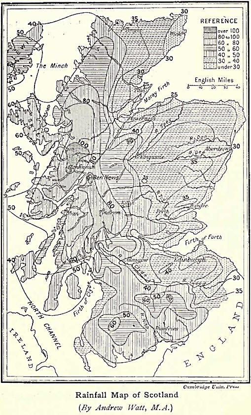 The isohyets, or lines separating districts that have approximately equal rainfall, divide Scotland into parts variously shaded according as their mean annual rainfall increases from 25 to over 100 inches. Study of the map shows that on the whole the rainfall of Forfarshire ranges from 30 to 35 inches per annum, and that this average is greatly exceeded as one proceeds westwards.