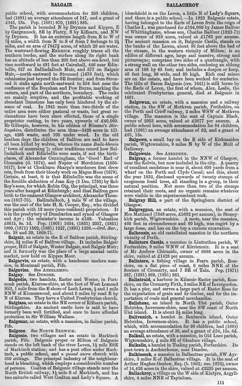 Balgair, Balgarvie, Balgavies, Balgay, Balgedie, Balglass, Balgonar, Balgone, Balgonie, Balgowan, Balgown, Balgownie, Balgray, Balgray Hill, Balgreggan, Balhousie, Balintore Castle, Balintore, Balintraid, Balisheac, Balivanich, Balkail, Balkello, Balkissock, Ballachroy