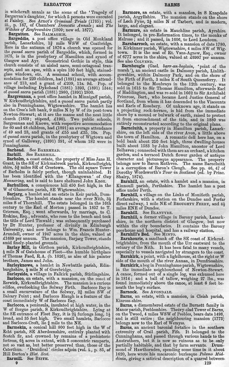 Bargatton, Bargeddie, Bargrennan, Barhead, Barhill, Barholm, Barhullion, Barjarg, Barlay Mill, Barleyknowe, Barleyside, Barlocco, Barmekin, Barmill, Barmore, Barmure, Barnbarroch, Barnbougle, Barncluith, Barnhill, Barnhill's Bed, Barnhourie, Barnkirk, Barnock, Barns