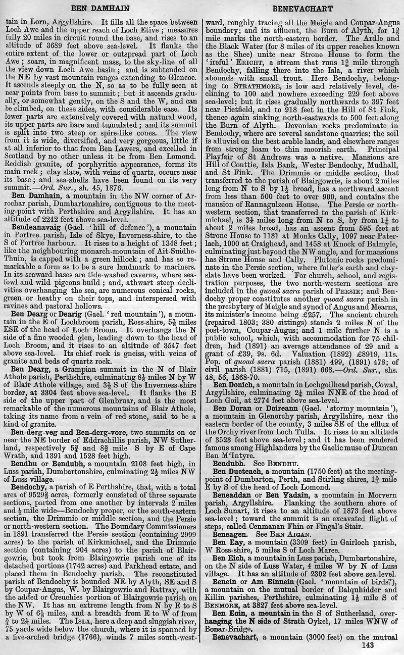 Ben Damhain, Bendeanavaig, Ben Dearg or Dearig, Ben Dearg, Ben-derg-veg and Ben-derg-vore, Bendhu or Bendubh, Bendochy, Ben Donich, Ben Doran or Doireann, Bendubh, Ben Ducteach, Beneaddan or Ben Yadain, Beneagen, Ben Eay, Ben Eich, Benein or Am Binnein, Ben Eoin, Benevachart