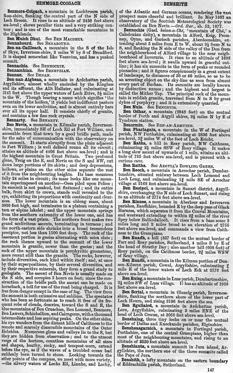 Ben-nan-Aighean, Bennarty, Ben Nevis, Bennochie, Ben Nuis, Ben Odhar,