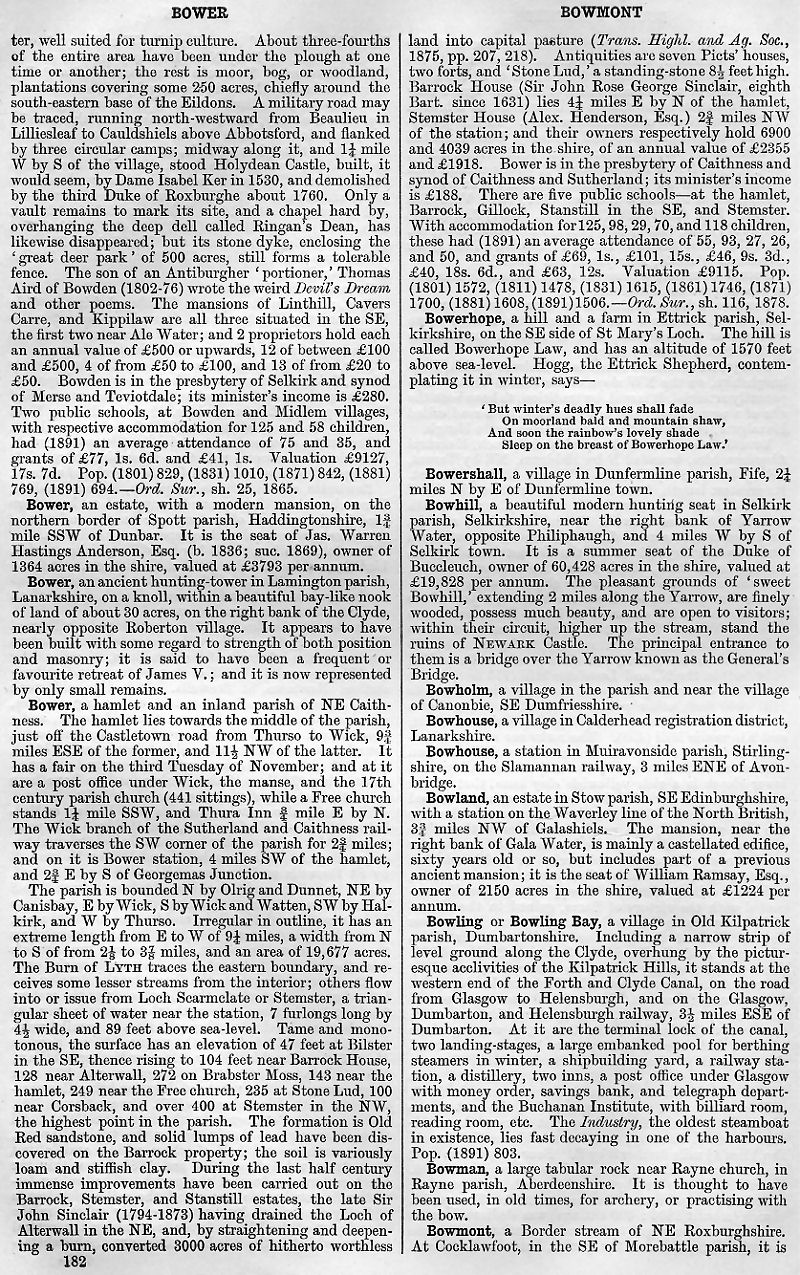 Bower, Bowerhope, Bowershall, Bowhill, Bowholm, Bowhouse, Bowland, Bowling or Bowling Bay, Bowman, Bowmont