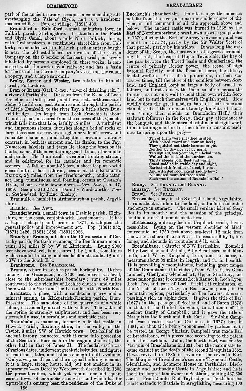 Brainsford or Bainsford, Braky - Easter and Wester, Bran or Braan, Branault, Brander, Branderburgh, Brandy or Branny, Branksome, Branny, Branteth, Branxholm, Brany, Brassy, Brawl, Breacacha, Breacdearg, Breadalbane