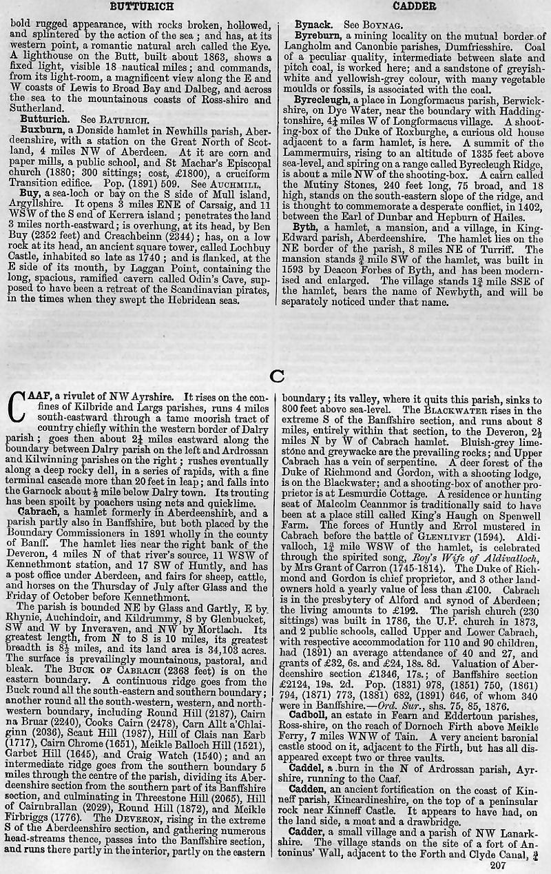 Butturich, Buxburn, Buy, Bynack, Byreburn, Byrecleugh, Byth, Caff, Cabrach, Cadboll, Caddel, Cadden, Cadder
