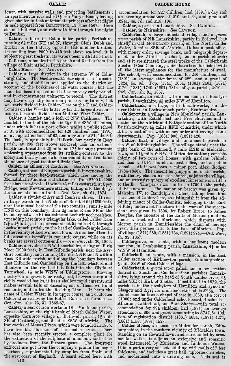 Calair, Calbruar, Calda House, Calder, Calderbank, Caldercruix, East Calder, Caldergrove, Calderhall, Calderhead, Calder House