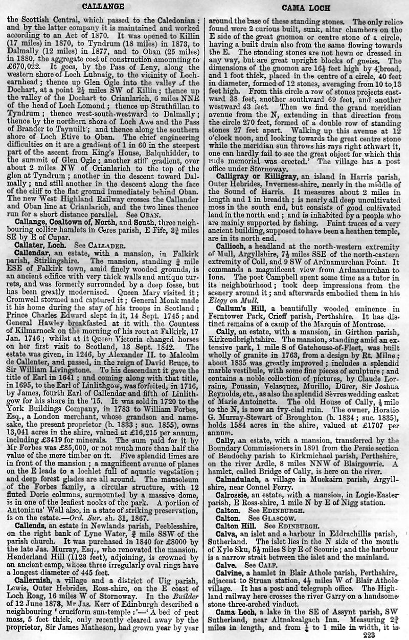 Coaltown of Callange North and South, Callater Loch, Callendar, Callends, Callernish, Calligray or Killigray, Callioch, Callum's Hill, Cally, Calnadulach, Calrossie, Calton, Calton Hill, Calva, Calve, Calvine, Cama Loch