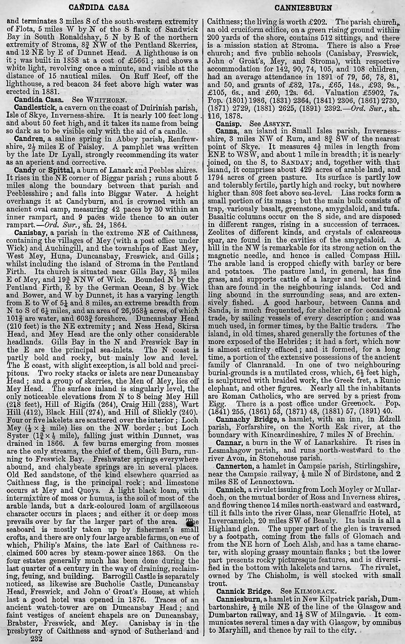 Candida Casa, Candlestick, Candren, Candy or Spittal, Canisbay, Canisp, Canna, Cannachy Bridge, Cannar, Cannerton, Cannich, Cannick Bridge, Canniesburn
