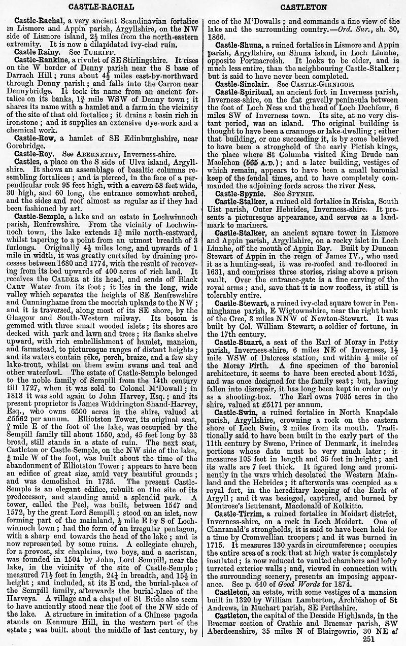 Castle-Rachal, Castle Rainy, Castle-Rankine, Castle-Row, Castle-Roy, Castle-Semple, Castle-Shuna, Castle-Sinclair, Castle-Spiritual, Castle-Spynie, Castle-Stalker, Castle-Stewart, Castle-Stuart, Castle-Swin, Castle-Tirrim, Catleton