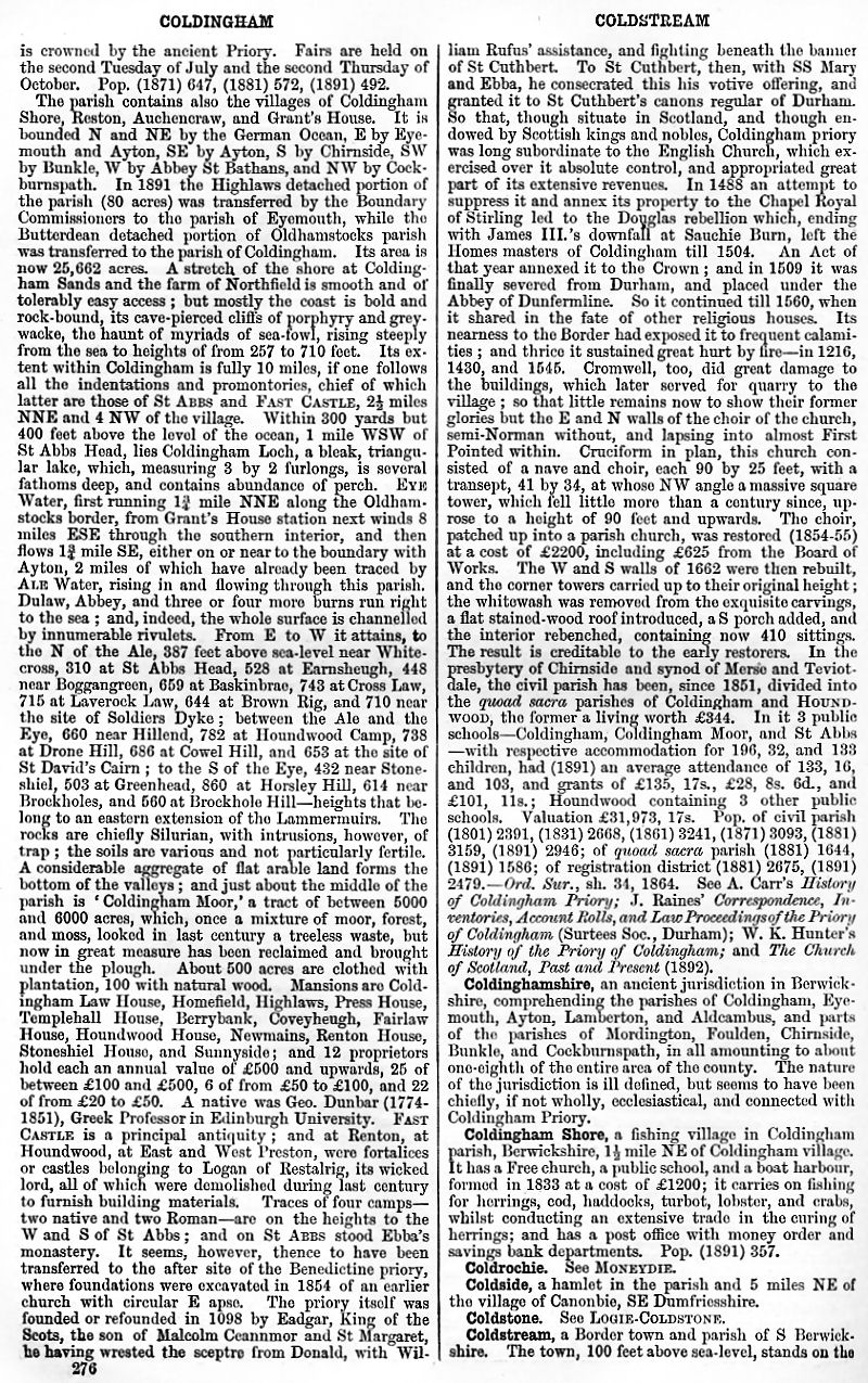 Coldingham, Coldinghamshire, Coldingham Shore, Coldrochie, Coldside, Coldstone, Coldstrea