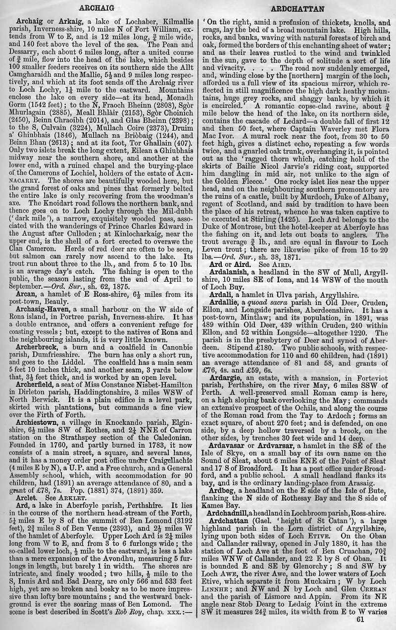 Archaig or Arkaig, Arcan, Archasig-Haven, Archerbreck, Archerfield, Archiestown, Arclet, Ard, Ard or Aird, Ardalanish, Ardall, Ardallie, Ardargie, Ardavasar or Ardvarsar, Ardbeg, Ardchadnill, Ardchattan