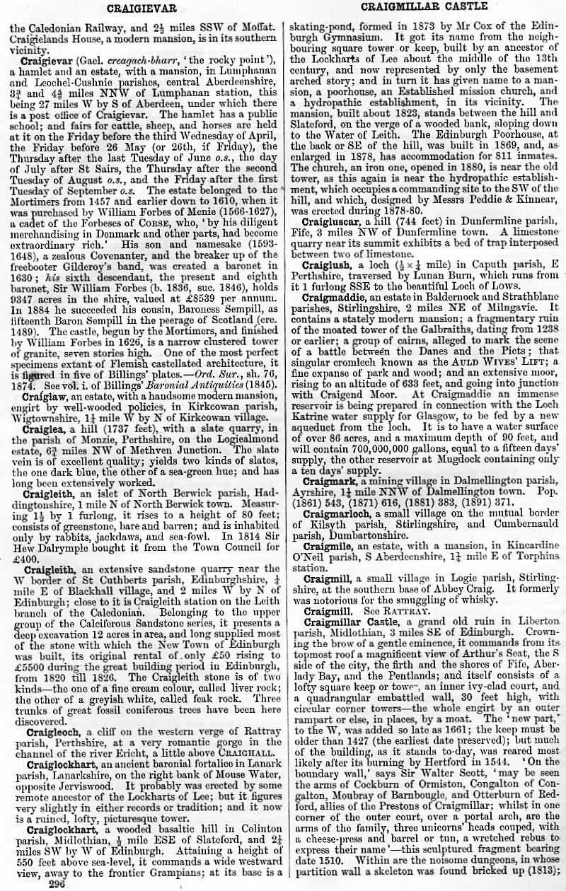 Craigievar, Craiglaw, Craiglea, Craigleith, Craigleoch, Craiglockhart, Craigluscar, Craiglush, Craigmaddie, Craigmark, Craigmarloch, Craigmile, Craigmill, Craigmillar Castle
