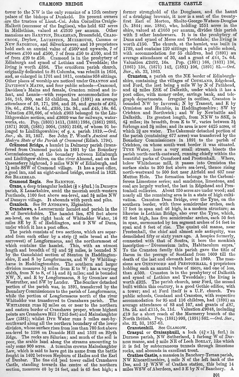Cramond Bridge, Cramond Regis, Crane, Cranloch, Cranshaws, Cranston, Cranstonhill, Craspul or Craisaphuill, Crathes castle