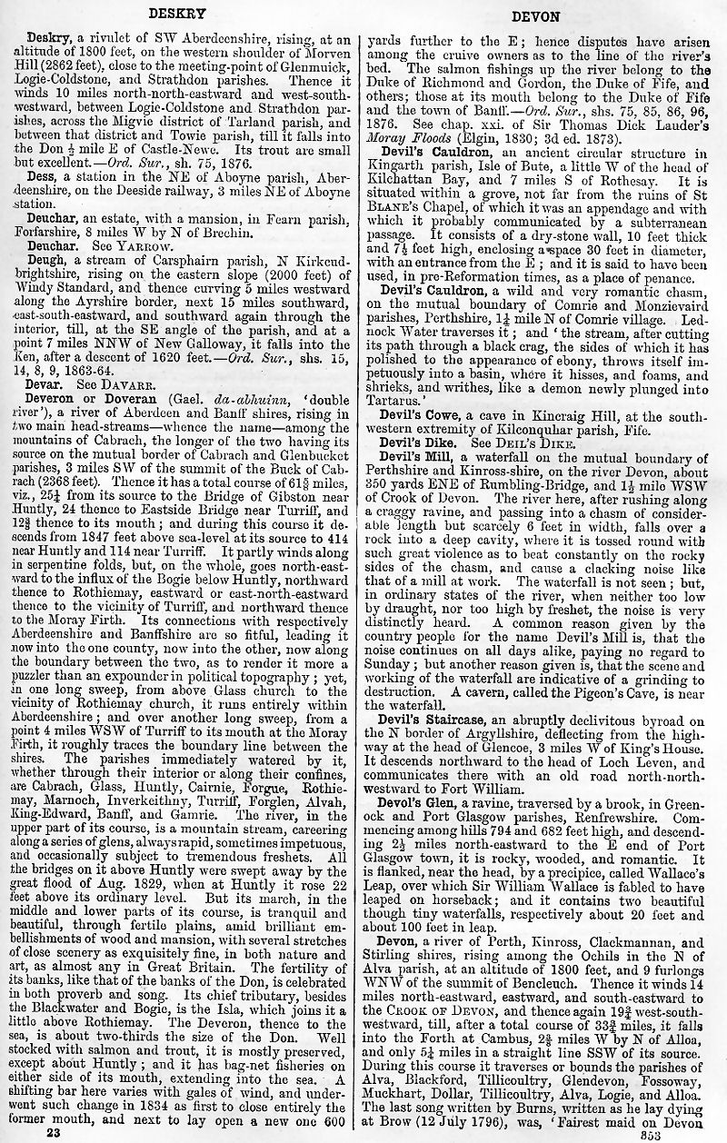 Deskry, Dess, Deuchar, Deugh, Devar, Deveron or Doveran, Devil's Cauldron, Devil's Cowe, Devil's Dike, Devil's Mill, Devil's Staircase, Devol's Glen, Devon