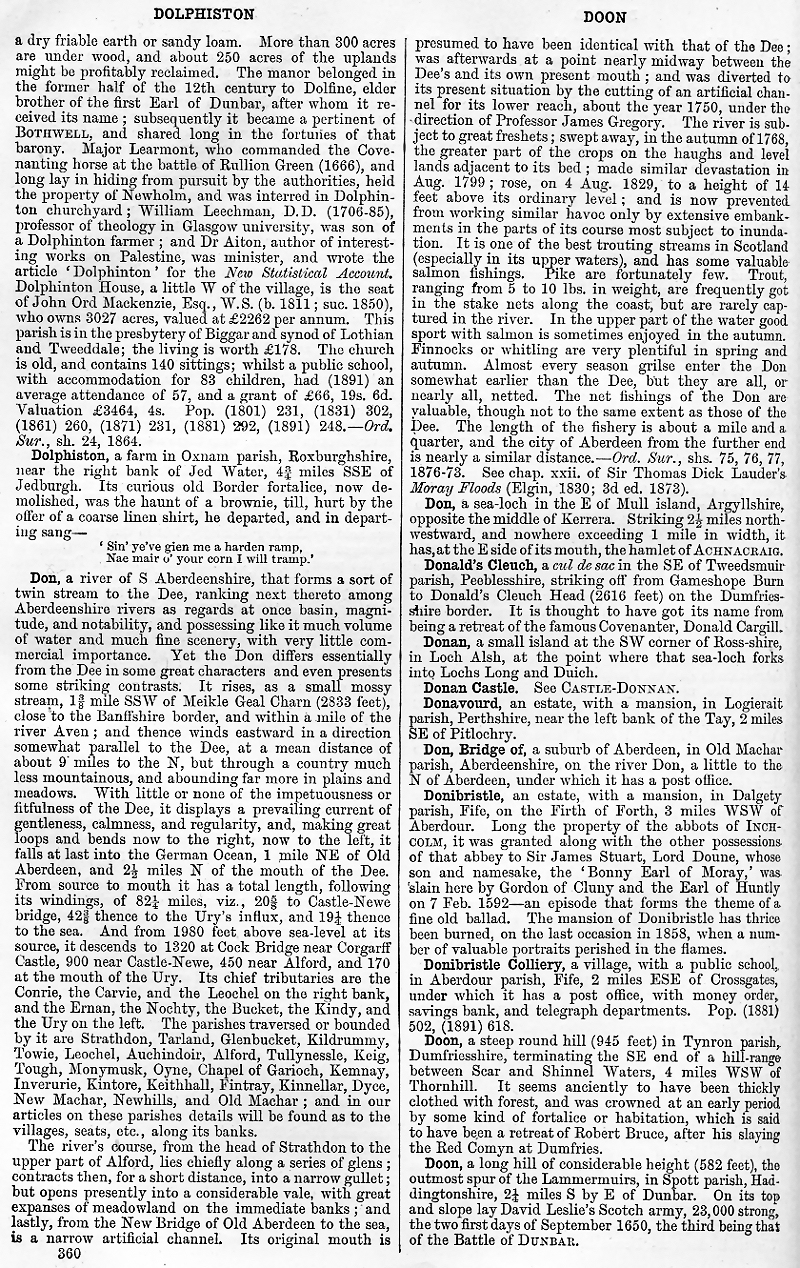 Dolphiston, Don, Donald's Cleuch, Donan, Donan Castle, Donavourd, Bridge of Don, Donibristle, Donibristle Colliery, Doon