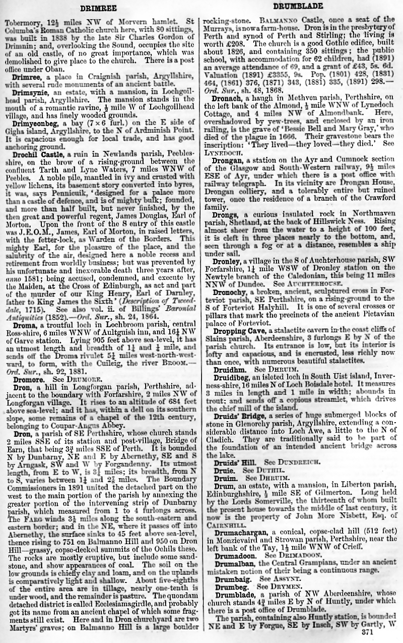 Drochil Castle, Droma, Dromore, Dron, Dronach, Drongan, Drongs, Dronley,