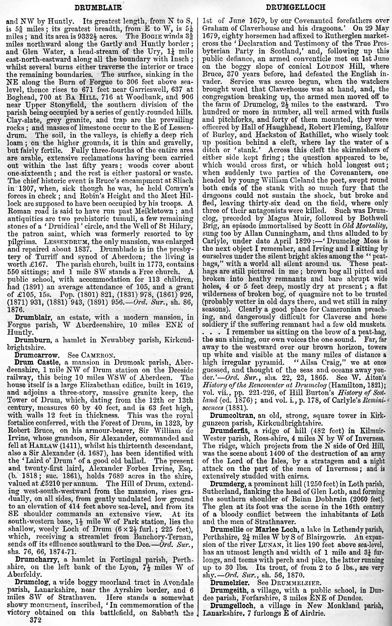 Drumblair, Drumburn, Drumcarrow, Drum Castle, Drumcharry, Drumclog, Drumcoltran, Drumderfit, Drumderg, Drumellie or Marlee Loch, Drumelzier, Drumgeith, Drumgelloch