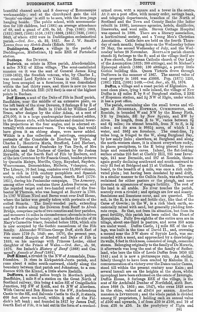 Easter Duddingston, Dudhope, Dudwick, Duff House, Duff-Kinnel, Dufftown, Duffus