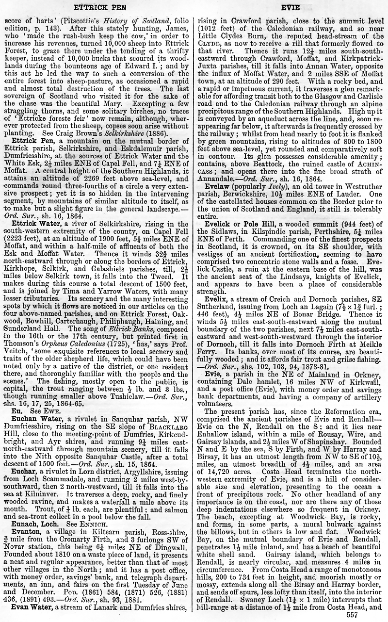 Ettrick Pen, Ettrick Water, Eu, Euchan Watter, Euchar, Eunack Loch, Evanton, Evan Water, Evelaw, Evelick or Pole Hill, Evelix, Evie