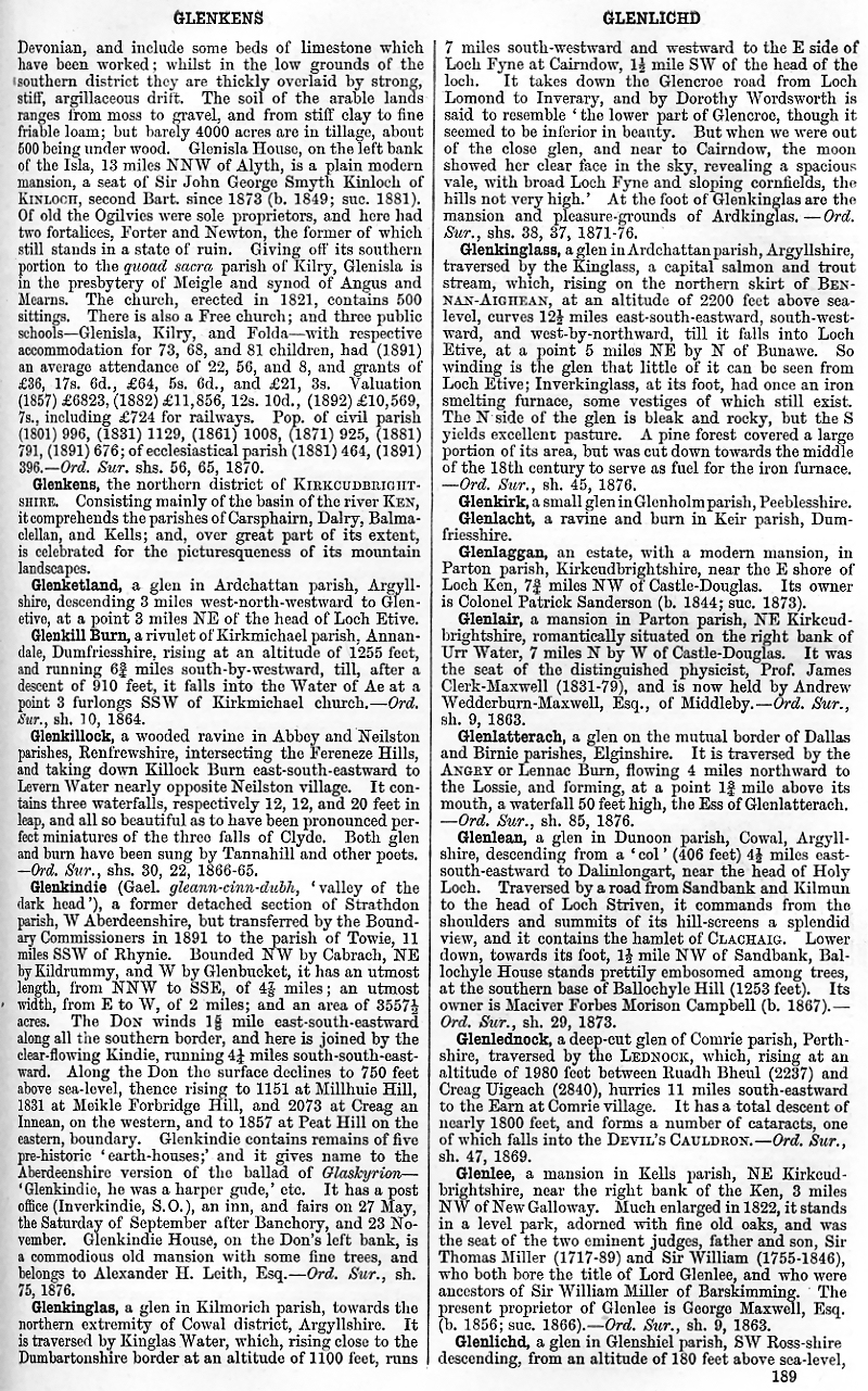 Glenisla, Glenkens, Glenketland, Glenkill Burn, Glenkillock, Glenkindie, Glenkinglas, Glenkinglass, Glenkirk, Glenlacht, Glenlaggan, Glenlair, Glenlatterach, Glenlean, Glenlednock, Glenlee, Glenlichd