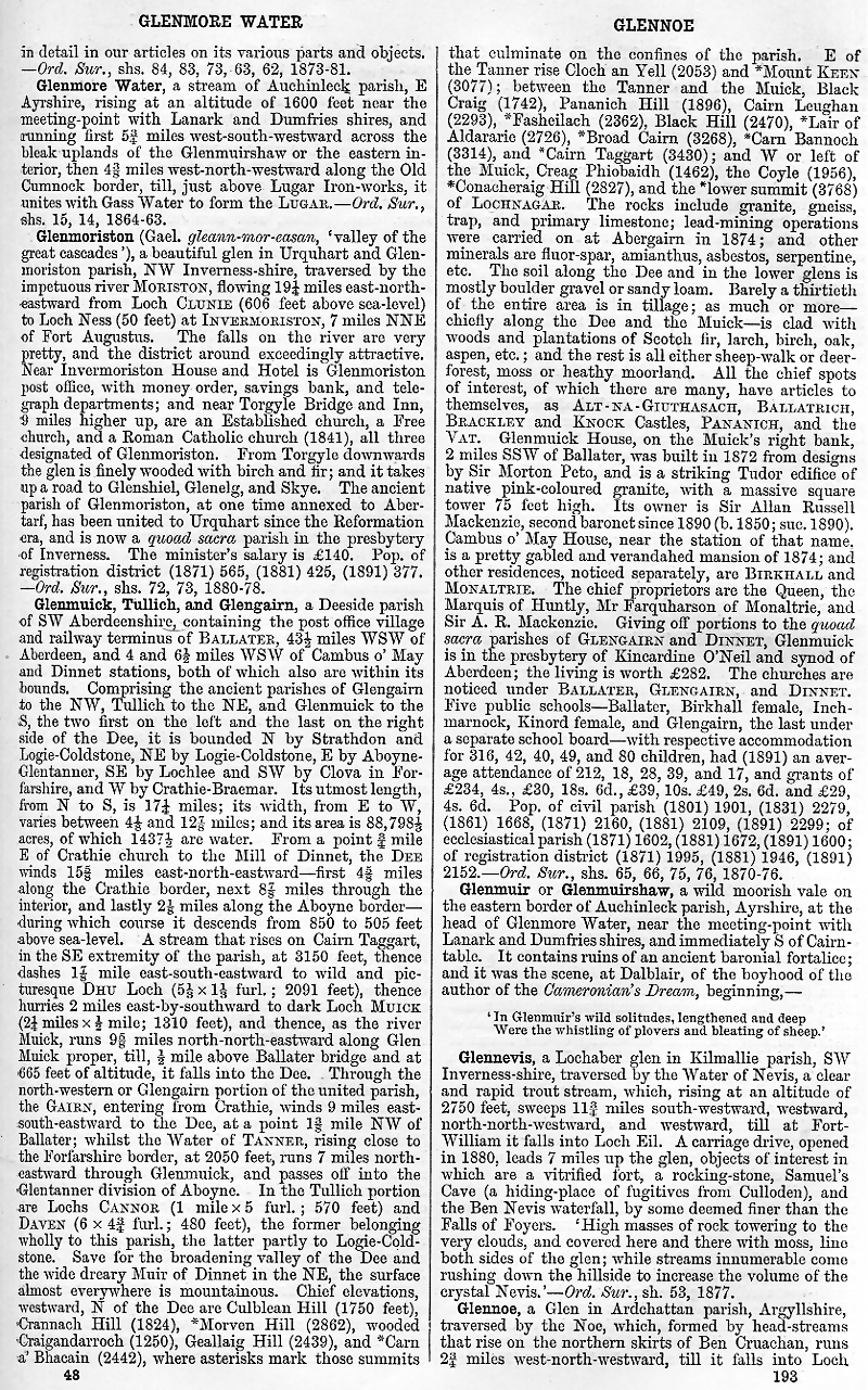 Glenmore Water, Glenmoriston, Glenmuick Tullich and Glengairn, Glenmuir or Glenmuirshaw, Glennevis, Glennoe