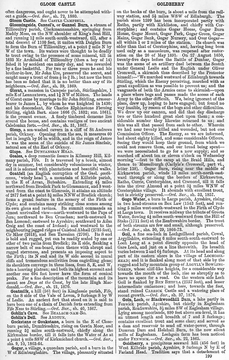 Cave, Goblin's Dell, Gockstane or Goukstane, Gogar, Gogo Water, Goil, Loch