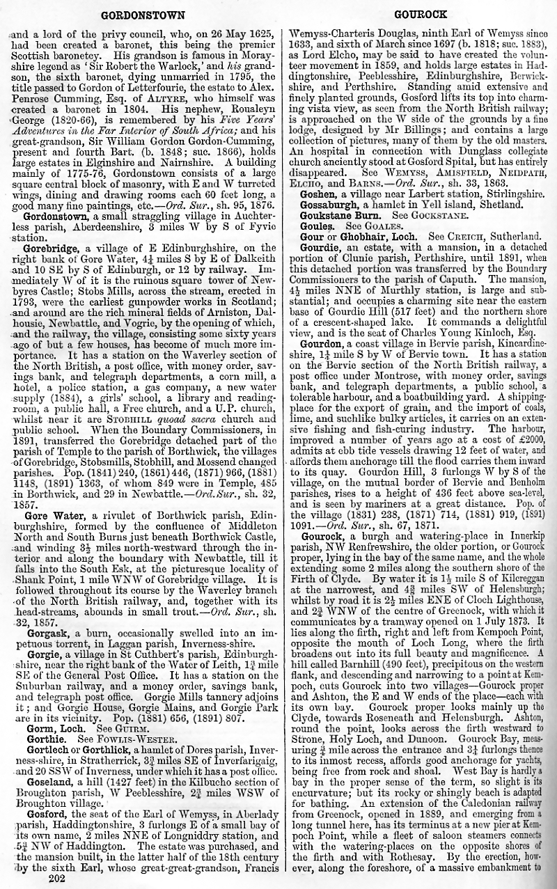 Gordonstown, Gorebridge, Gore Water, Gorgask, Gorgie, Loch Gorm, Gorthie, Gortlech or Gorthlick, Goseland, Gosford, Goshen, Gossaburgh, Goukstane Burn, Goules, Gour or Loch Ghobhair, Gourdie, Gourdon, Gourock