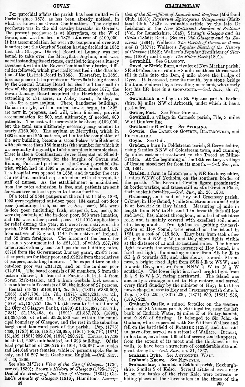 Govan, Govanhill, Govel or Elrick Burn, Gowanbank, Port Gower, Gowkhall, Gowland or Gowling, Gowrie, Goyle, Graden, Graemsay, Graham's Castle, Graham's Dyke, Graham's Knowe, Grahamslaw