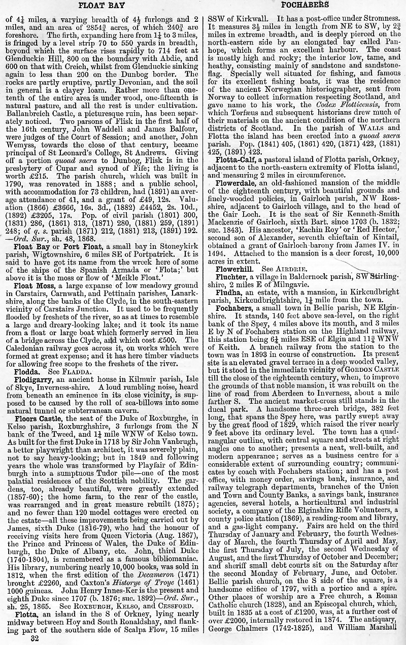 Float Bay or Port Float, Float Moss, Flodda, Flodigarry, Floors Castle, Flotta, Flotta-Calf, Flowerdale, Flowerhill, Fluchter, Fludha, Fochabers