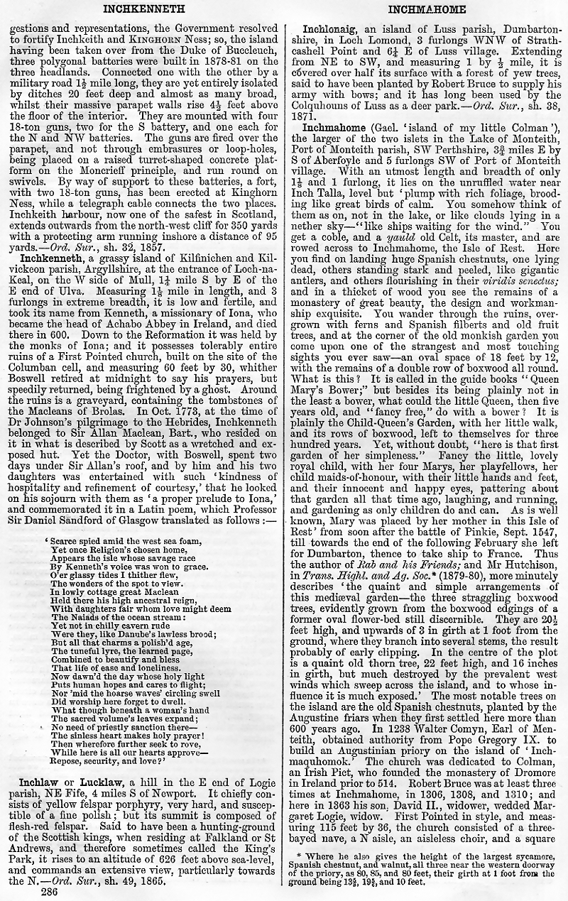 Inchkeith, Inchkenneth, Inchlaw or Lucknow, Inchlonaig, Inchmahome