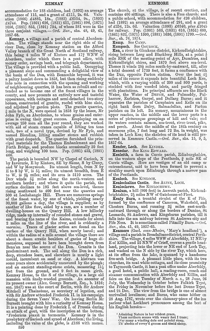 Kemnay, Kemp, Kempoch, Ken, Loch Kender, Kenedar, Kenleith, Kenloch, Kenlochaline Castle, Kenlochewe, Kenlum, Kently Burn, Kenmore