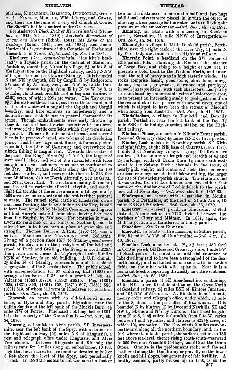 Kincardineshire, Kinclaven, Kincorth, Kincraig, Kincraigie, Kincraig Point, Kindallachan, Kindeace House, Kindeace House, Loch Kinder, Kindrogan, Kinearny, Kineddar, Kinedder, Kinellan Loch, Kinellar